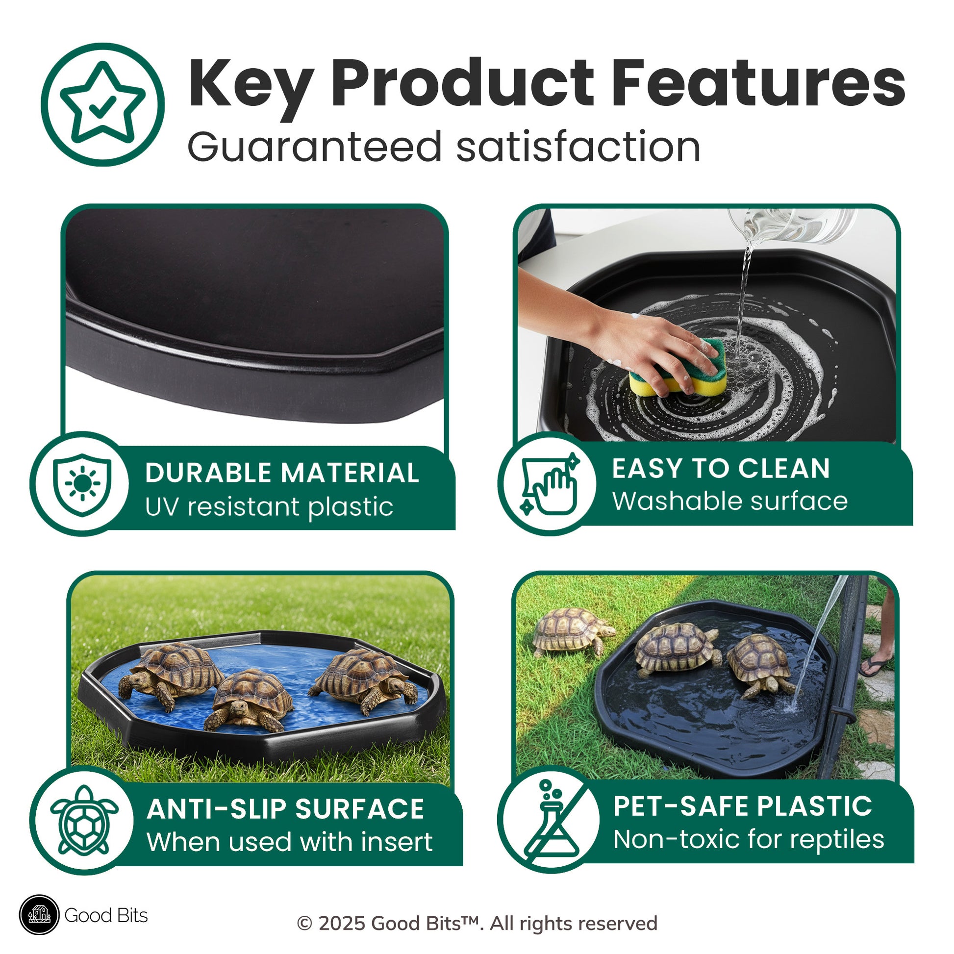 Spacious, low-entry soaking tray for turtles, tortoises, and reptiles. Offers safe hydration, basking, and rest. BPA-free, UV-protected plastic. Easy to enter, easy to clean, and built for indoor or outdoor use.